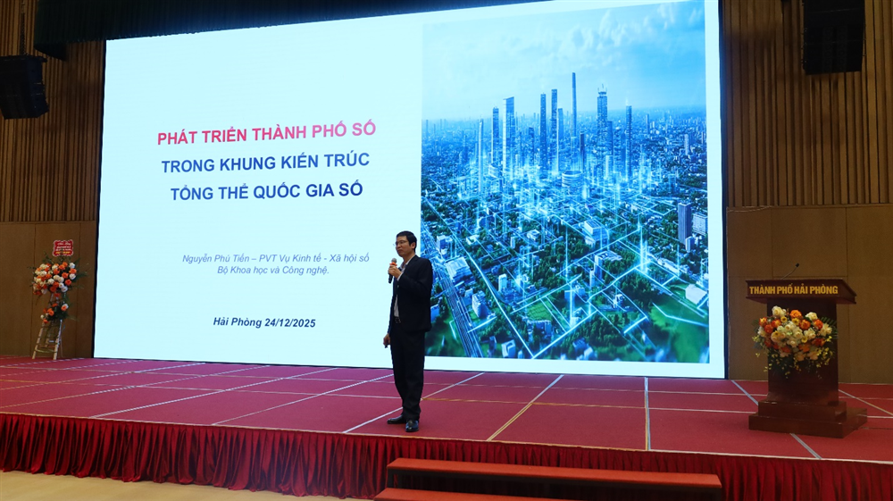 Sáng 24/12, Sở Khoa học và Công nghệ (KH&CN) thành phố Hải phòng tổ chức Diễn đàn Chuyển đổi số thành phố Hải Phòng năm 2025 với chủ đề “Kiến tạo thành phố số - Khát vọng kỷ nguyên mới” tại Trung tâm Hội Nghị - Biểu diễn thành phố Hải Phòng. Diễn đàn nhằm trao đổi, chia sẻ kinh nghiệm, mô hình và các giải pháp thực tiễn giữa cơ quan quản lý nhà nước, các chuyên gia, viện nghiên cứu, trường đại học và doanh nghiệp công nghệ trong quá trình triển khai xây dựng Thành phố số, đô thị thông minh.