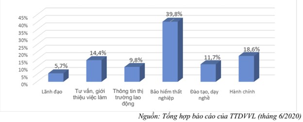Về quy mô, cơ cấu nhân lực và công tác đào tạo, bồi dưỡng nhân lực: Chưa có định mức biên chế cho các trung tâm DVVL, chưa có quy định chung về mã tiêu chuẩn, chức danh nghề nghiệp của viên chức hoạt động trong lĩnh vực dịch vụ việc làm, đa số các trung tâm đang thực hiện chế độ hợp đồng lao động. Hoạt động đào tạo nâng cao năng lực cho cán bộ trung tâm DVVL chưa tổ chức thường xuyên. Các hoạt động chuyên môn, nghiệp vụ còn nhiều bất cập, chưa thống nhất về quy trình nghiệp vụ tư vấn, giới thiệu việc làm và cung ứng lao động; về biểu mẫu, đặc biệt là biểu mẫu thu thập thông tin người tìm việc, việc tìm người và các danh mục liên quan khác… ; cơ chế tài chính chưa phù hợp, với nguồn hỗ trợ ngân sách cho các hoạt động cốt lõi (tư vấn, giới thiệu việc làm, cung ứng lao động, thông tin, phân tích dự báo về TTLĐ) còn thấp. Nguồn từ Quỹ bảo hiểm thất nghiệp (BHTN) chủ yếu tập trung cho việc chi chế độ cho người lao động thực hiện nhiệm vụ sự nghiệp BHTN, chi cho các hoạt động chuyên môn có liên quan như thu thập, phân tích dự báo thông tin thị trường lao động, tư vấn, giới thiệu việc làm cho người thất nghiệp được bố trí ít từ hoạt động quản lý BHTN và không ổn định.